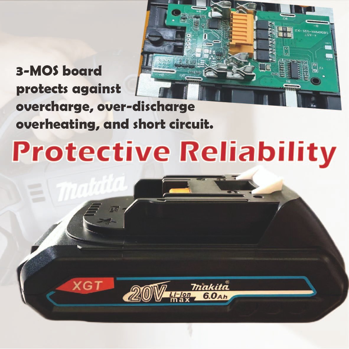 Designed as a replacement for Makita 18-21V power tools, this 20V 6.0Ah lithium battery features 5 high-rate Samsung 21700 cells for strong and stable performance. With a slim 1.18-inch profile, it’s lightweight and fits easily into tight spaces. Equipped with a triple MOS protection board, it safeguards against overcharge, over-discharge, overheating, and short circuits for enhanced safety and durability. Compared to original 18V 6.0 batteries, it offers better portability and cost-effectiveness, helping you work more efficiently in various scenarios.